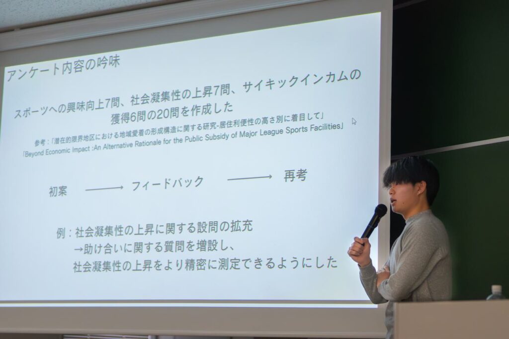 多くの学生が、研究の背景と目的を丁寧に説明し、フィールドワークや分析の過程を具体的に示し、得られた成果を語っていました。どの人の研究も「自分の問いとして掘り下げた研究」になっていた点が印象的でした。発表後には、教員からの質疑応答が行われました。学生たちは、教員からの想定外の質問に戸惑いながらも、自らの研究を振り返り、整理し、論理的に答えていました。