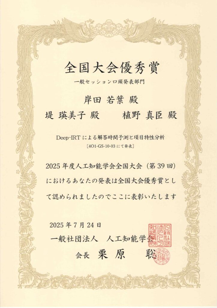 本学科教員の堤瑛美子専任講師らが、2025年度人工知能学会全国大会にて『Deep-IRTにおける回答時間予測と項目特性分析』を発表し、全国大会優秀賞を受賞しました。(https://www.ai-gakkai.or.jp/about/award/jsai_award-conf/