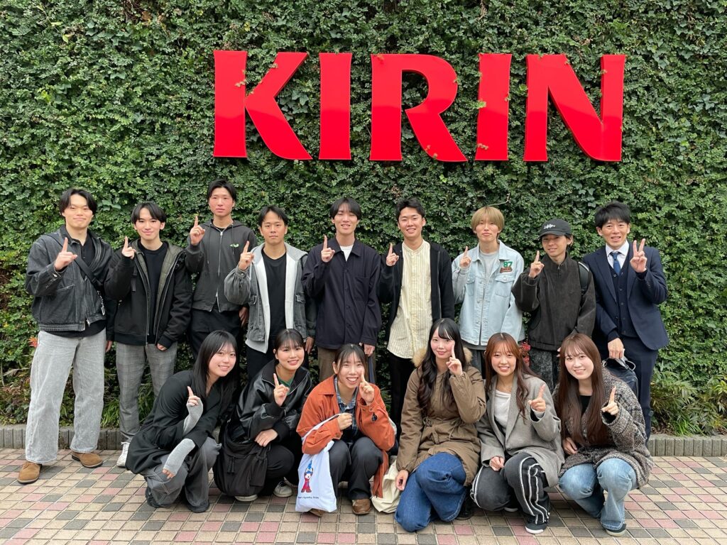 11月5日、山本研究室のメンバーが共同研究先であるキリンホールディングス飲料未来研究所を訪問しました。研究員の方からは、大学で学ぶ基礎的な心理学とは異なる、企業における実践的な応用心理学の取り組みや知見についてご説明いただきました。続いての工場見学では、視覚・嗅覚・味覚などの感覚を通してビールの製造工程を体験し、五感で学ぶことの面白さを改めて実感しました。工程を理解したうえで味わった「一番搾り」は、普段とは一味違う特別な美味しさでした。今回の訪問は、実際の現場で活かせる卒業論文のテーマを見つける良い機会となりました。ご案内いただいたキリンホールディングスの皆様に心より御礼申し上げます。
